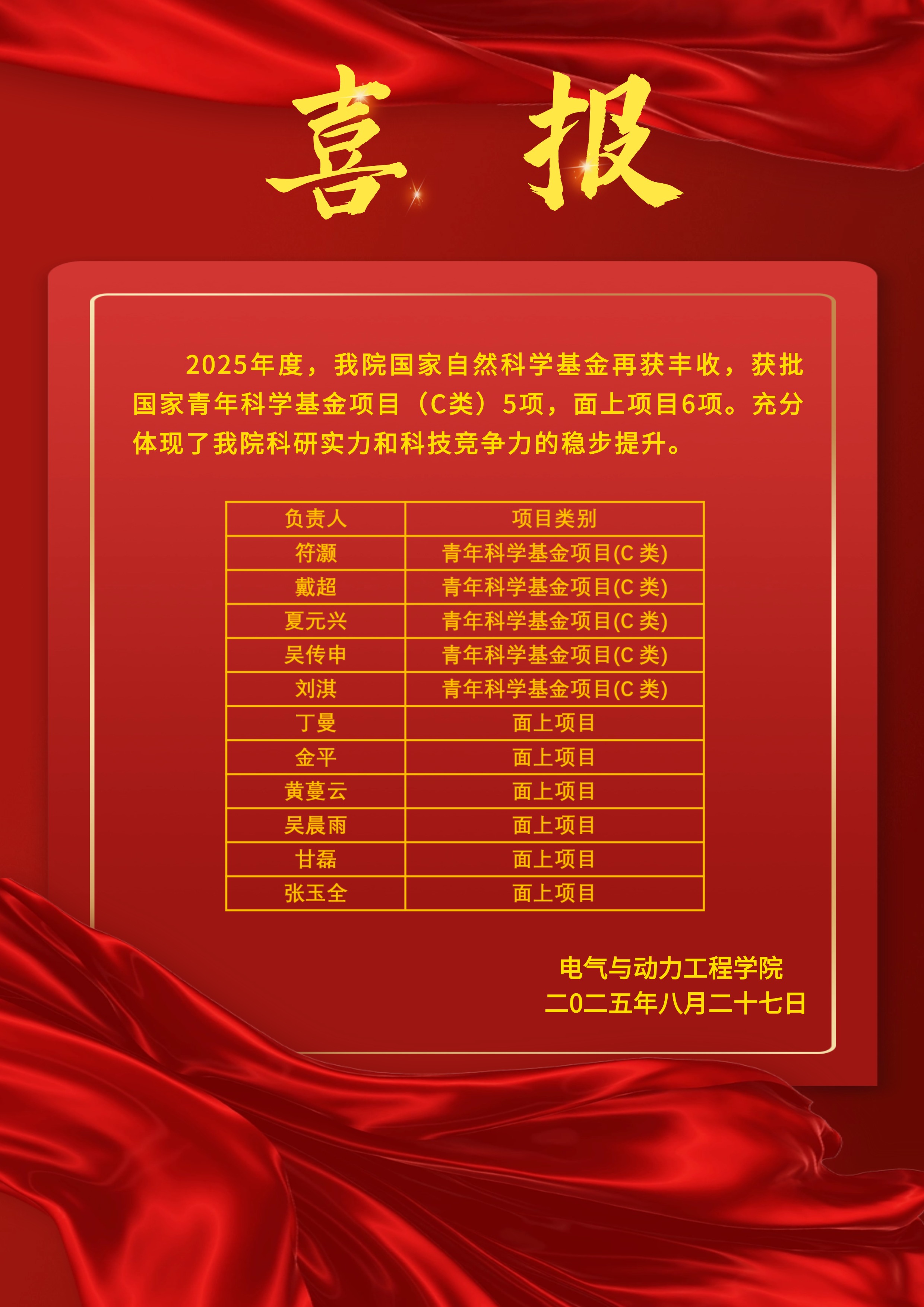 近日,国家自然科学基金委员会公布了2025年度项目评审结果。电气院本年度共获批项目11项。其中:面上项目获...