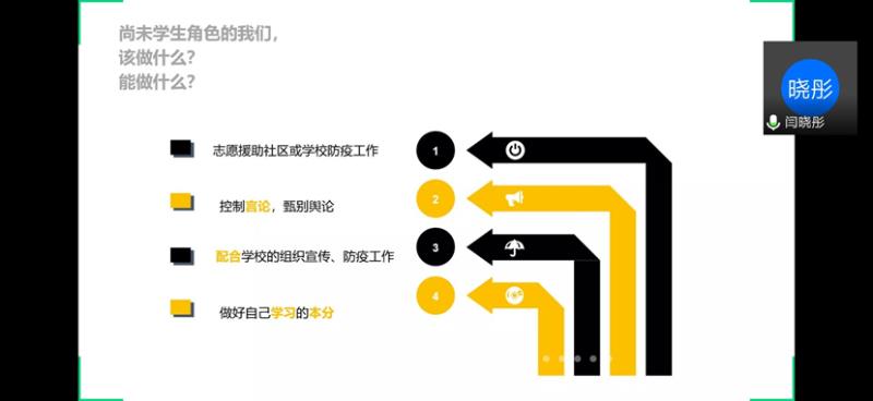 五四青年节前夕,为深入学习习近平总书记给北京大学援鄂医疗队全体“90后”党员的重要回信精神,进一步继承并发扬“五四精神”,快猫短视频 举办“战‘疫’有我——青春微团课”主题活动,宣传快猫短视频 青年志愿服务、抗击疫情的先进事迹。粟洨悦、闫晓彤、普月、王琛四位亲身参与抗疫志愿服务的能电学子,分享了服务经历及个人感受。活动依托腾讯会议线上开展,近120位团员参加了活动。