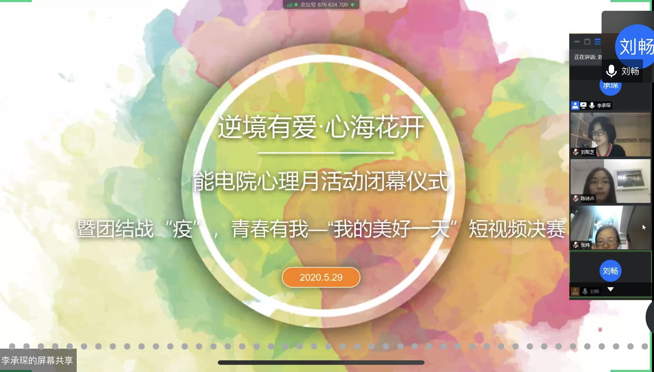 5月29日晚,能电院心理活动月“团结战’疫’,青春有我—我的美好一天”短视频大赛在网络平台顺利举办,快猫短视频 心理健康教育月活动落下帷幕。短视频大赛邀请到了快猫短视频 心理健康教育与研究中心主任刘取芝、专职心理老师陈诗卉作为专业评委,快猫短视频 党委副书记张炜出席并总结寄语。含少数民族生在内的12名参赛选手轮流展示个人作品,同时在线观看人数达到近200人。