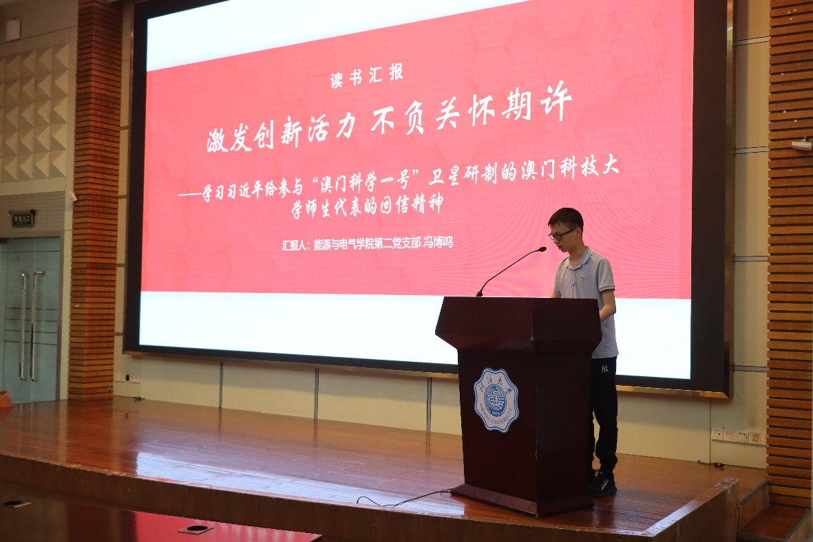 本科生第二党支部的冯博鸣同学带来习近平给参与“澳门科学一号”卫星研制的澳门科技大学师生代表的回信的学习和分享。他说道,科技人才应继续发扬艰苦奋斗、无私奉献、爱岗敬业精神,把对祖国对人民的热爱融入奋斗历程,让科技之花绽放在祖国每一片土地上,为实现中华民族伟大复兴的中国梦贡献创新创造的磅礴伟力。