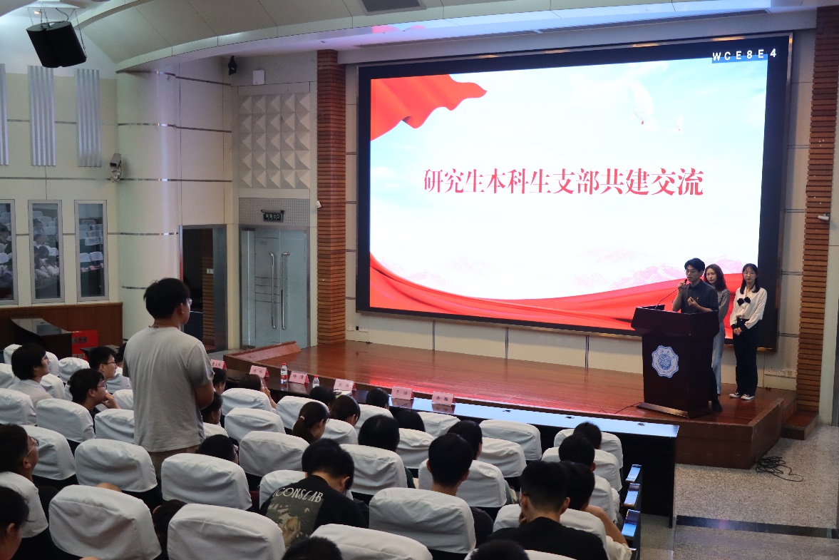 在本科生支部与研究生支部共建交流环节中,邀请三位优秀的研究生党员代表为本科生介绍研究生的学习生活。博士生普月分享生涯规划与职业指导,告诫本科生要多尝试多探索,了解自己、探索职业,才能找准自己的人生道路。硕士生倪涵艺分享研究生阶段的社会实践经历与感受,鼓励本科生进入研究生阶段在科研之外也要多实践、多经历。硕士生赵灿分享研究生阶段的科研经验,指导本科生不要怕在科研中遇到困难与失败,找准方法、潜心钻研。本科生党员就自己在这三方面存在的困惑进行了提问,研究生代表们耐心回答,给予建议。