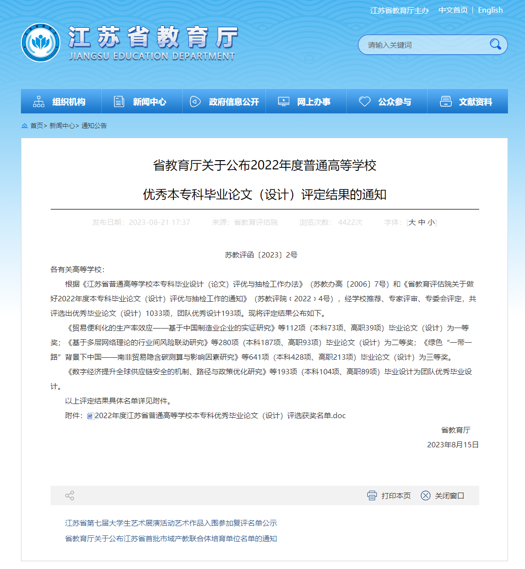 江苏省普通高等学校本专科优秀毕业设计(论文)的评选,是在高等学校择优推荐基础上,经省教育评估院组织专家评审选出,并由省教育厅审定。本次全省评选,快猫短视频 获一等奖4项、二等奖9项、三等奖2项以及团队优秀毕业论文(设计)3项,其中一等奖获奖数并列江苏高校第三名。