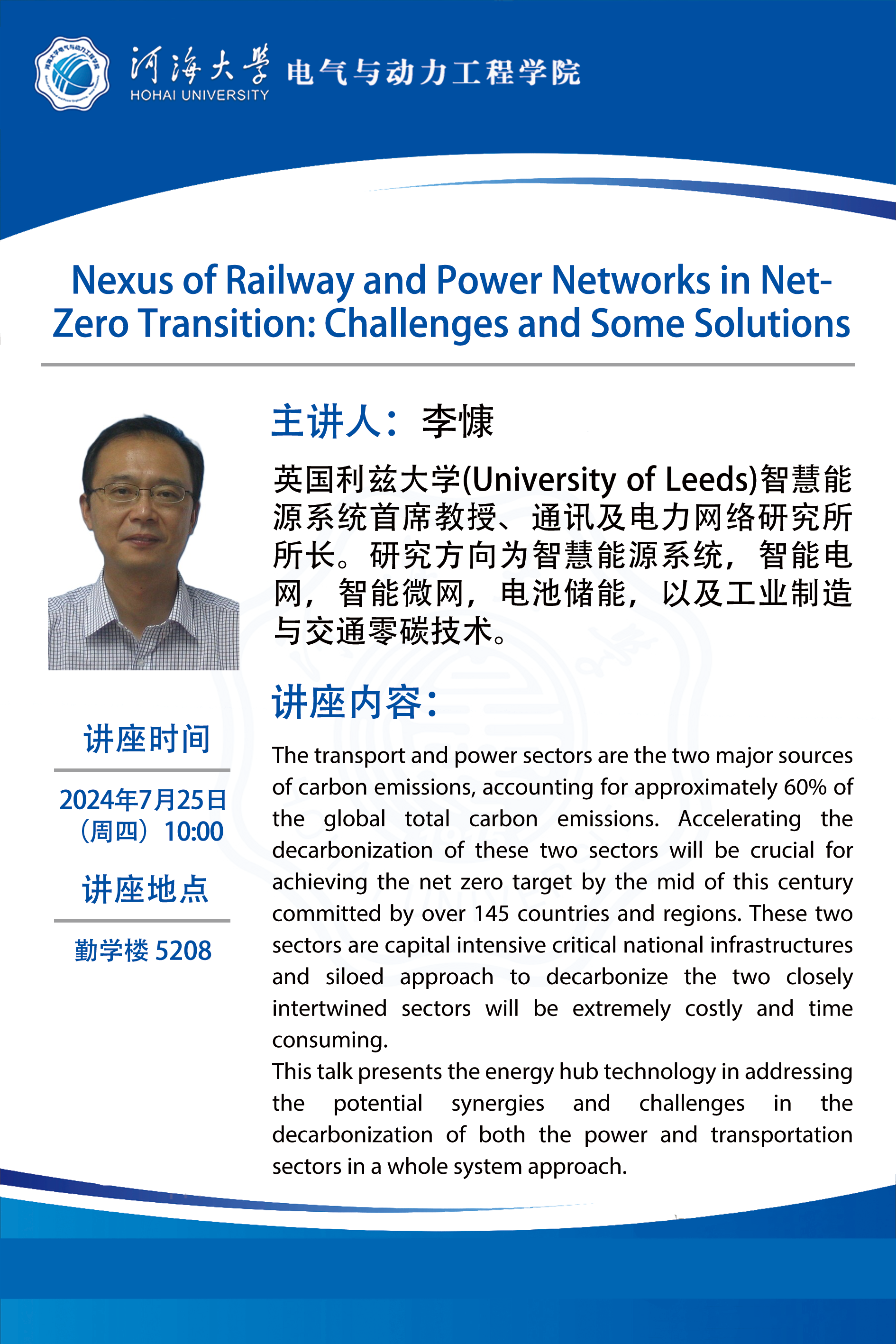 学术讲座:Nexus of Railway and Power Networks in Net-Zero Transition: Challenges and Some Solutions