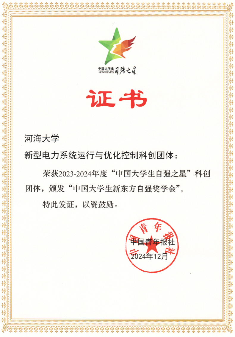 近日,由共青团中央、全国学联指导,团中央基层建设部、中国青年报社等单位联合举办的2023-2024年度“中国大学生自强之星”奖学金评选活动落下帷幕,快猫短视频新型电力系统运行与优化控制科创团体荣获“中国大学生自强之星”科创团体(全国仅100支科创团体获得该荣誉)。