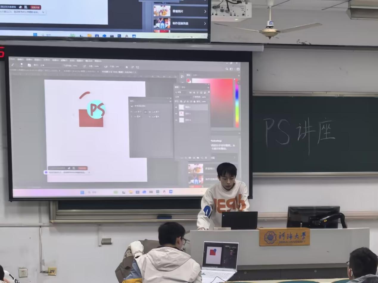 赛前,考虑到不少同学对PS软件尚不熟悉,新媒体部专门组织了一场PS基础讲座,围绕图层操作、蒙版运用、色彩搭配等常用功能进行讲解与演示,帮助同学们在短时间内掌握必要技能,为后续创作打下基础。